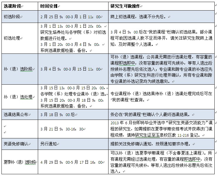 本次选课分初选、补(退)选、夏季补(退)选等三个阶段,具体时间安排详见下表。