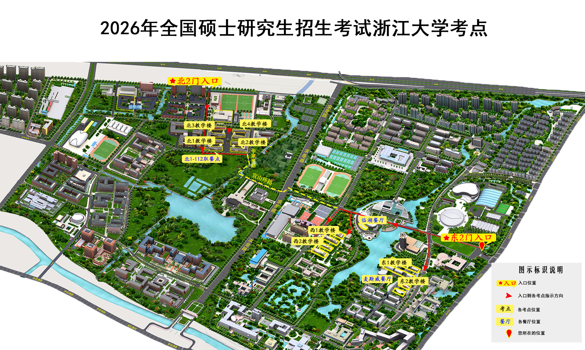 2026年全国硕士研究生招生考试将于2025年12月20日—21日举行。浙江大学考点考场分布在紫金港校区东1、东2、西1、西2、北3(段永平教学楼3,下同)、北4(段永平教学楼4,下同)教学楼。为确保考生顺利应试,特制定考生须知,请考生务必仔细阅读并严格遵守相关规定。
